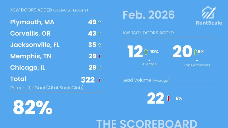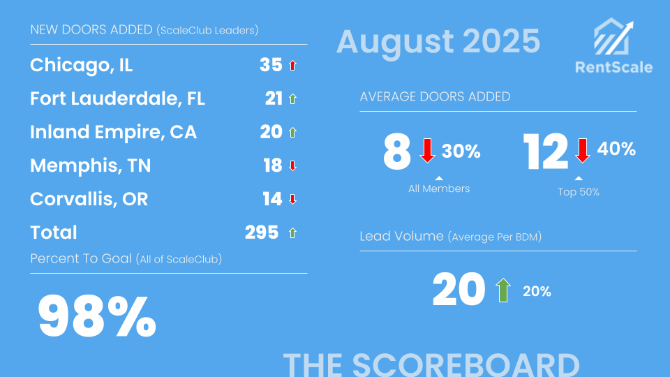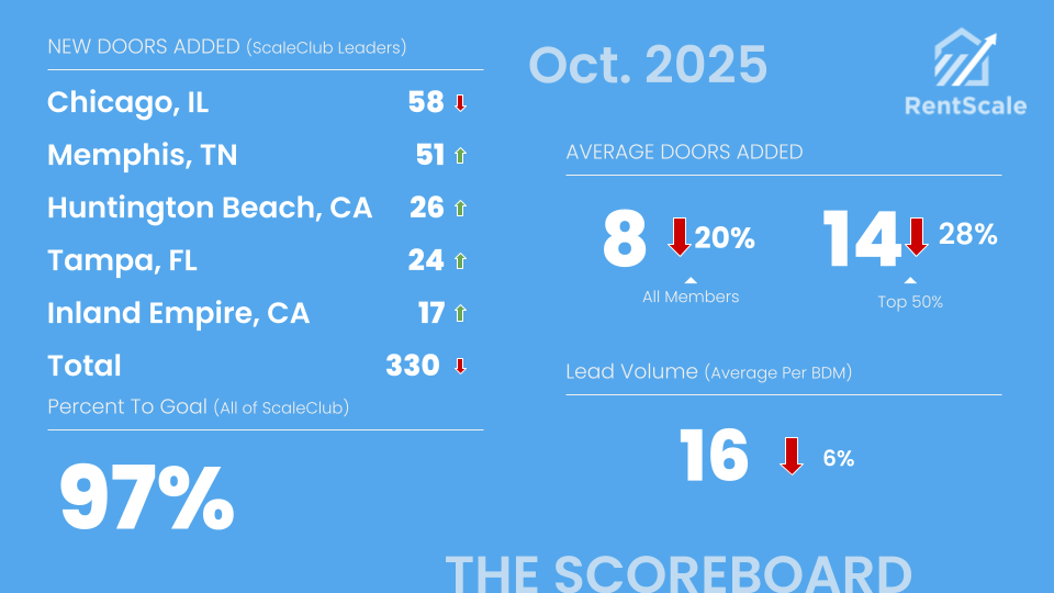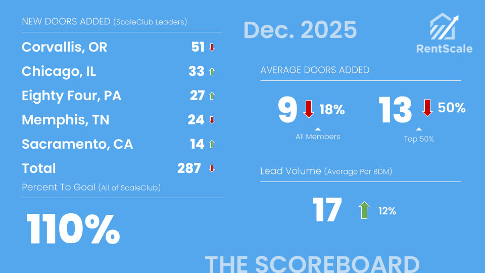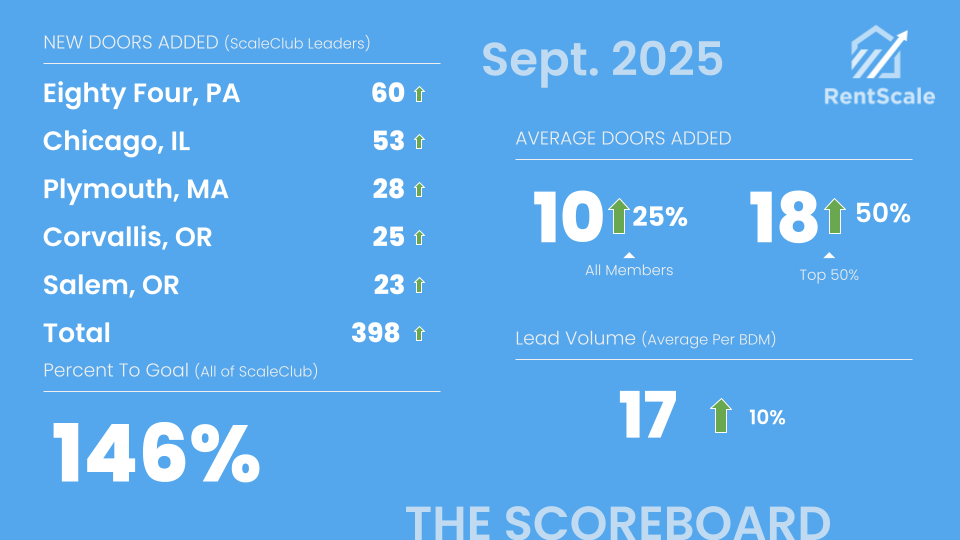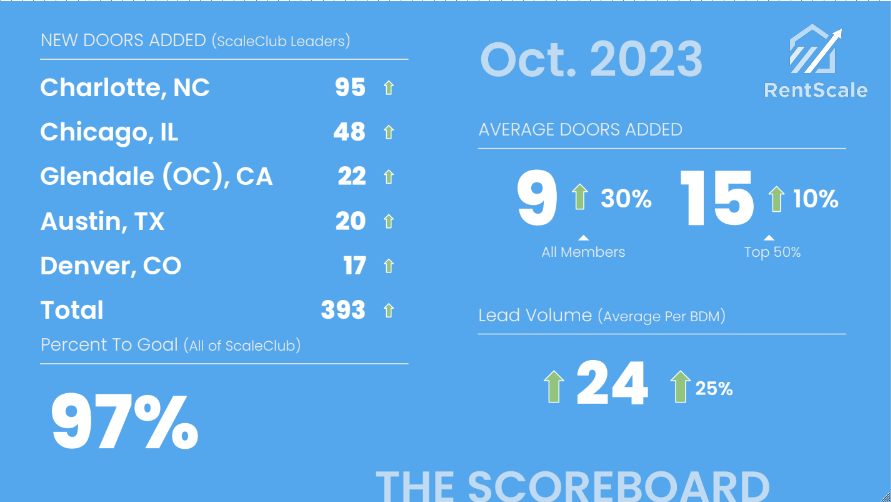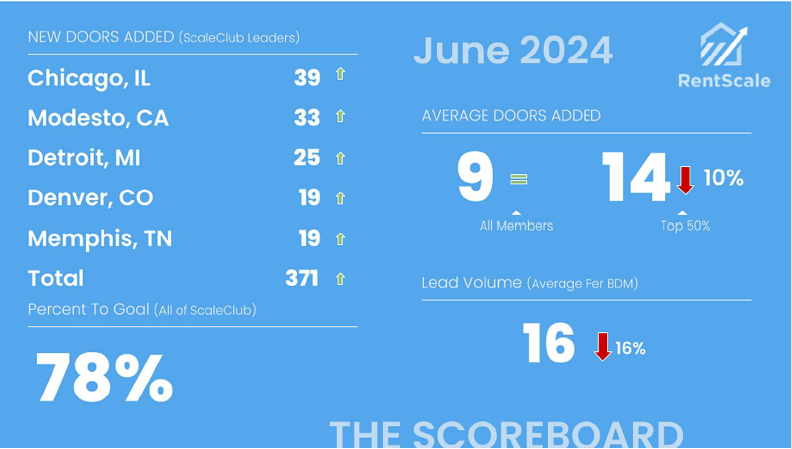 RentScale runs the largest community of property management sales professionals in North America.—we call it ScaleClub. We share a public scoreboard each month of how the community is doing overall and who the leaders are. Contact us today to see if your company can qualify to be on the scoreboard.