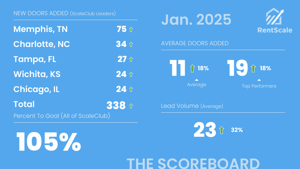 RentScale runs the largest community of property management sales professionals in North America.—we call it ScaleClub. We share a public scoreboard each month of how the community is doing overall and who the leaders are. Contact us today to see if your company can qualify to be on the scoreboard.
